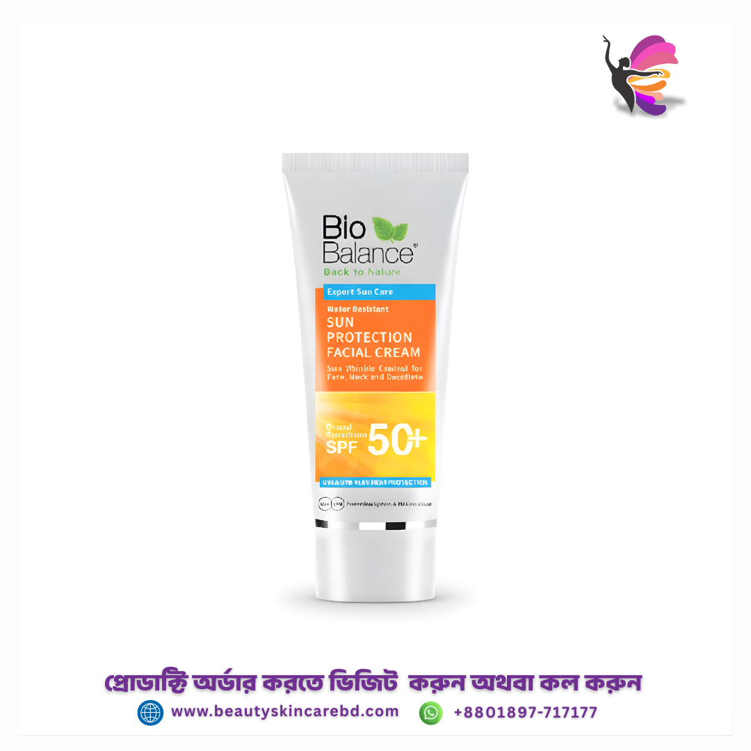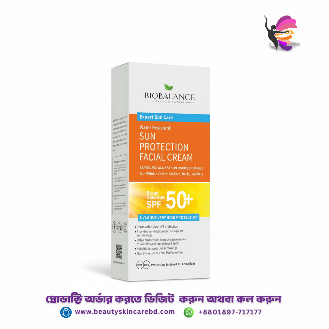 Bio Balance Sun Protection Facial Cream SPF 50+ সান প্রোটেকশন ফেসিয়াল ক্রিমটি একটি এক্সপার্ট সান কেয়ার ফর্মুলা, যা ত্বককে সূর্যের কারণে সৃষ্ট ক্ষতি থেকে উচ্চ সুরক্ষা (Very High Protection) প্রদান করে। এটি ব্রড স্পেকট্রাম এসপিএফ ৫০+ সুরক্ষার মাধ্যমে ইউভিএ ও ইউভিবি রশ্মি থেকে ত্বককে রক্ষা করে। ক্রিমটি জল প্রতিরোধক (Water Resistant), তাই সাঁতার বা ঘামের পরেও সুরক্ষা বজায় থাকে। এর বিশেষত্ব হলো এটি নন-স্টিকি এবং শাইন-মুক্ত টেক্সচার দেয়, যা মুখে কোনো তেলতেলে ভাব বা সাদা আভা তৈরি করে না। এটি বলিরেখা এবং সূর্যের কারণে হওয়া দাগ-ছোপ কমাতেও সাহায্য করে।