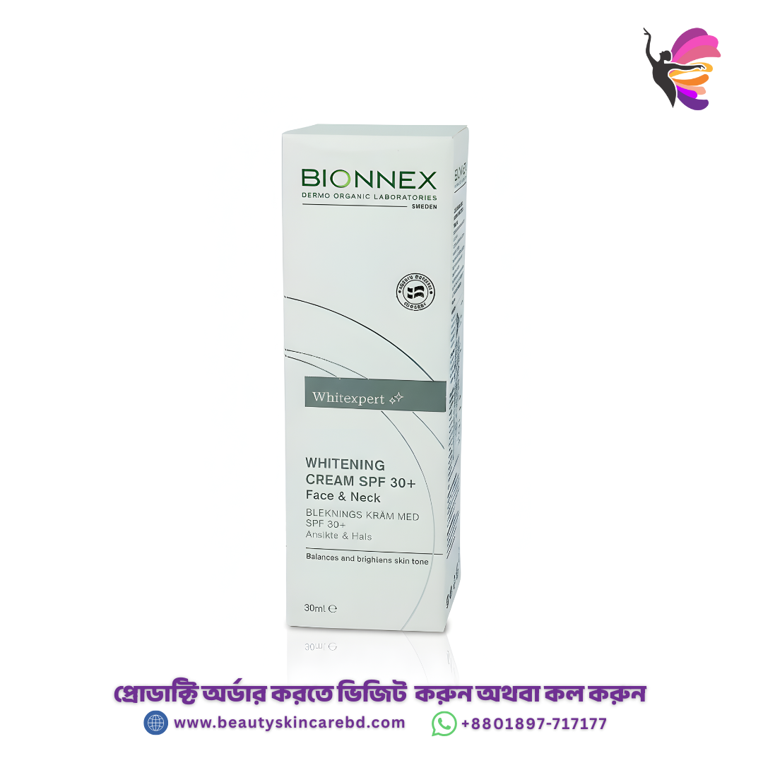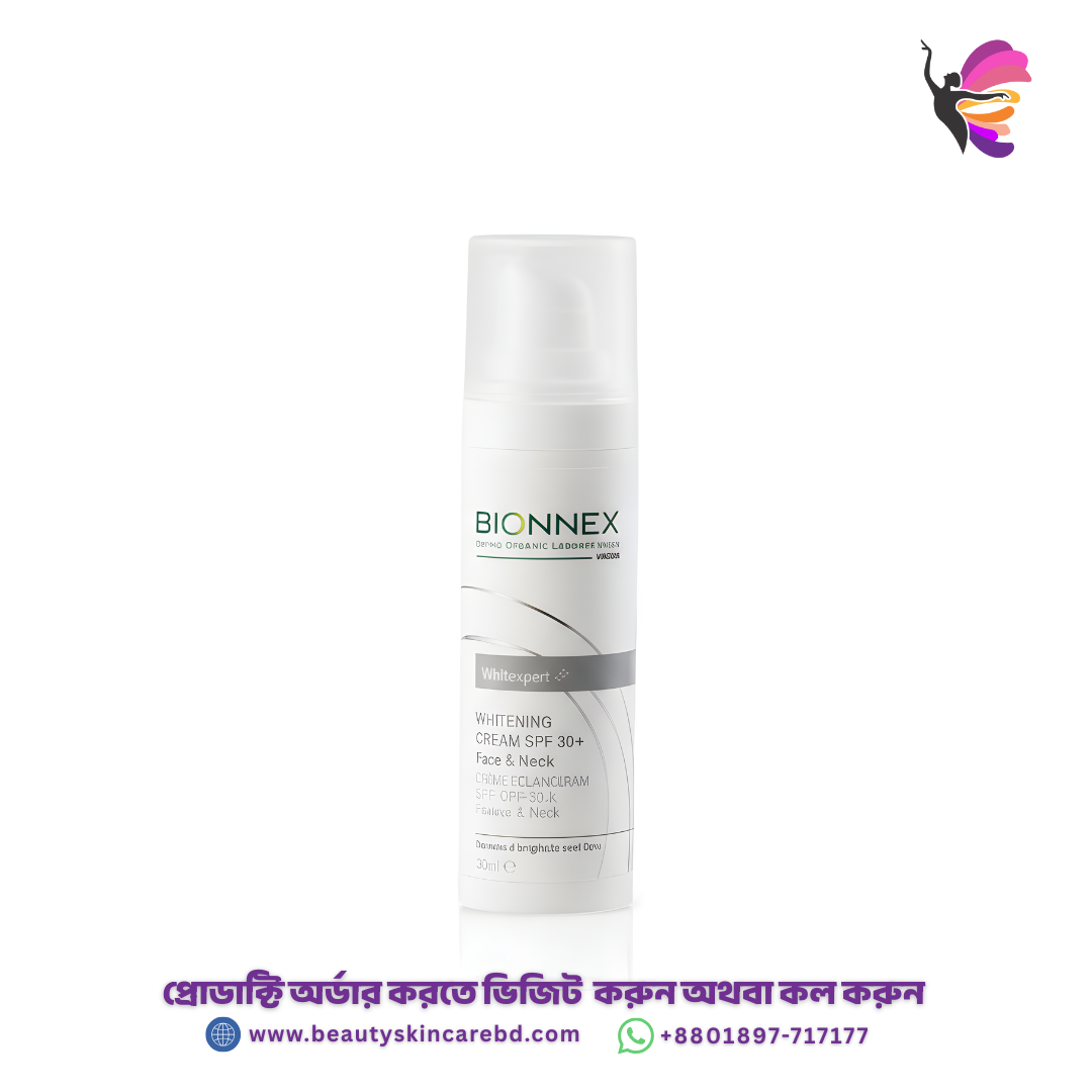 Bionnex Whitexpert Whitening Cream SPF 30+ হলো একটি বিশেষ ক্রিম যা ত্বকের রঙ উজ্জ্বল করা এবং একই সাথে সূর্যের ক্ষতিকারক রশ্মি থেকে ত্বককে রক্ষা করার জন্য তৈরি করা হয়েছে। এর হার্বাল সূত্র ত্বকের পিগমেন্টেশন (যেমন কালো দাগ, মেছতা) কমাতে সাহায্য করে। এতে থাকা এসপিএফ ৩০+ ত্বককে সূর্যের UVA এবং UVB রশ্মির কারণে হওয়া ক্ষতি, যেমন অকাল বার্ধক্য এবং আরও দাগ হওয়া থেকে সুরক্ষা দেয়। এটি ডার্মাটোলজিক্যালি পরীক্ষিত।