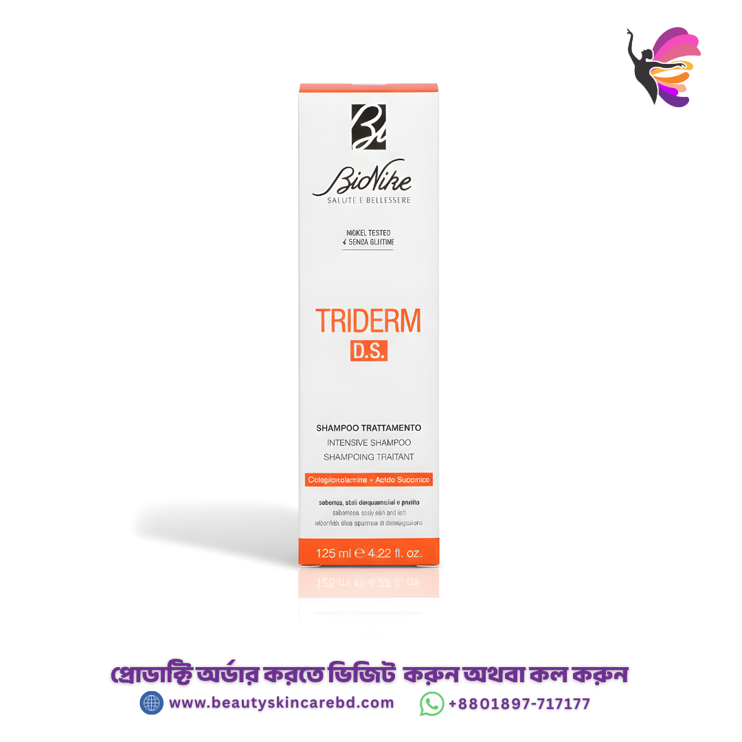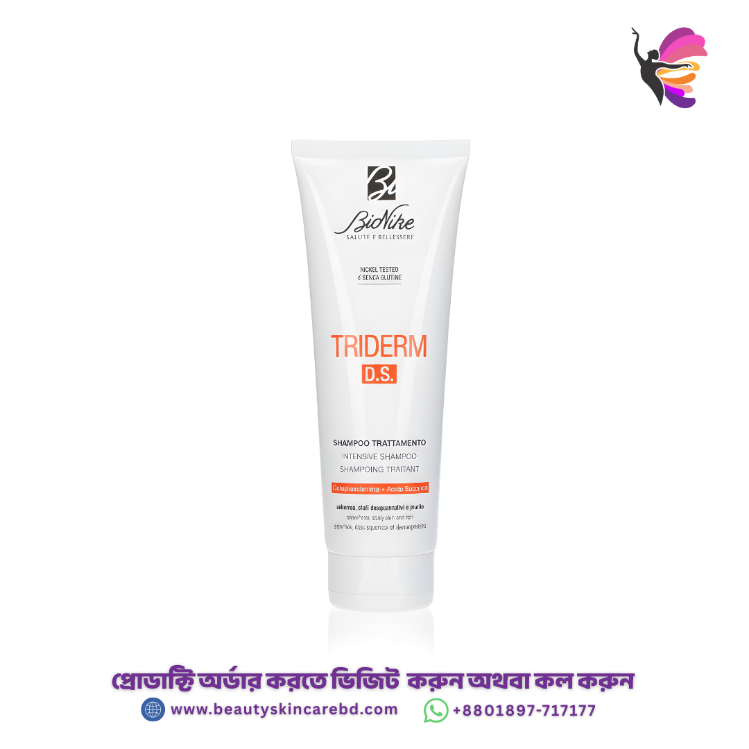 Triderm D.S Shampoo হলো একটি বিশেষ চিকিৎসা শ্যাম্পু, যা সেবোরিক ডার্মাটাইটিস এবং জেদি খুশকির চিকিৎসার জন্য ডিজাইন করা হয়েছে। এর সক্রিয় উপাদানগুলির সংমিশ্রণ মাথার ত্বকের তেল উৎপাদন নিয়ন্ত্রণ করে এবং প্রদাহ ও ছত্রাকের বৃদ্ধি কমায়। এটি কার্যকরভাবে চুলকানি, লালচে ভাব এবং ফ্লেকিং (খুশকি) দূর করে। এর ফর্মুলাটি মাথার ত্বককে শান্ত রাখে এবং চুলের স্বাস্থ্য বজায় রেখে আলতোভাবে পরিষ্কার করে।